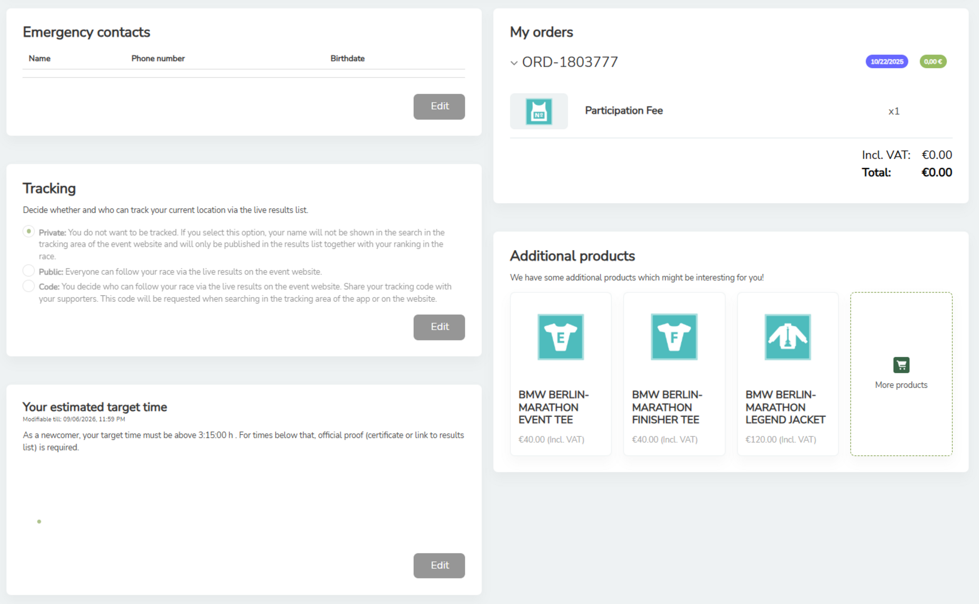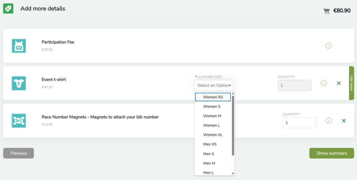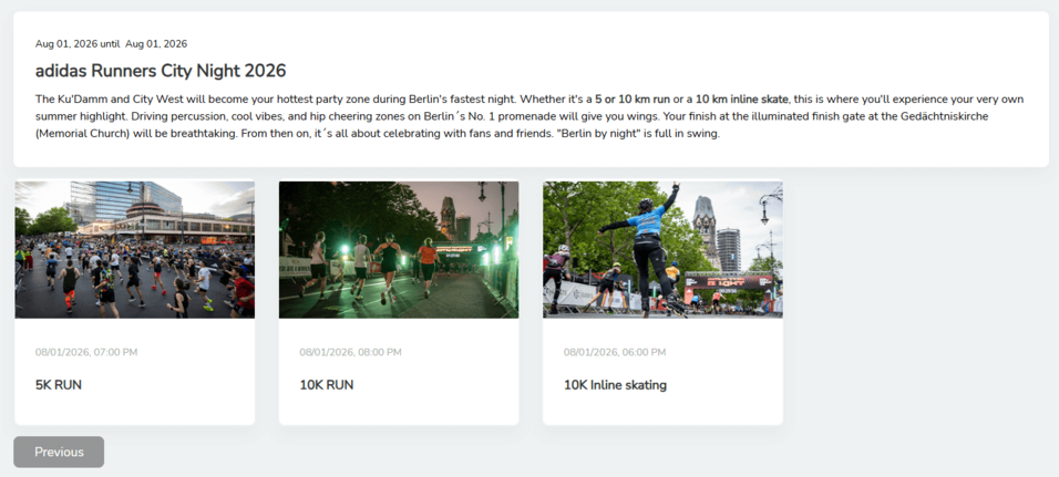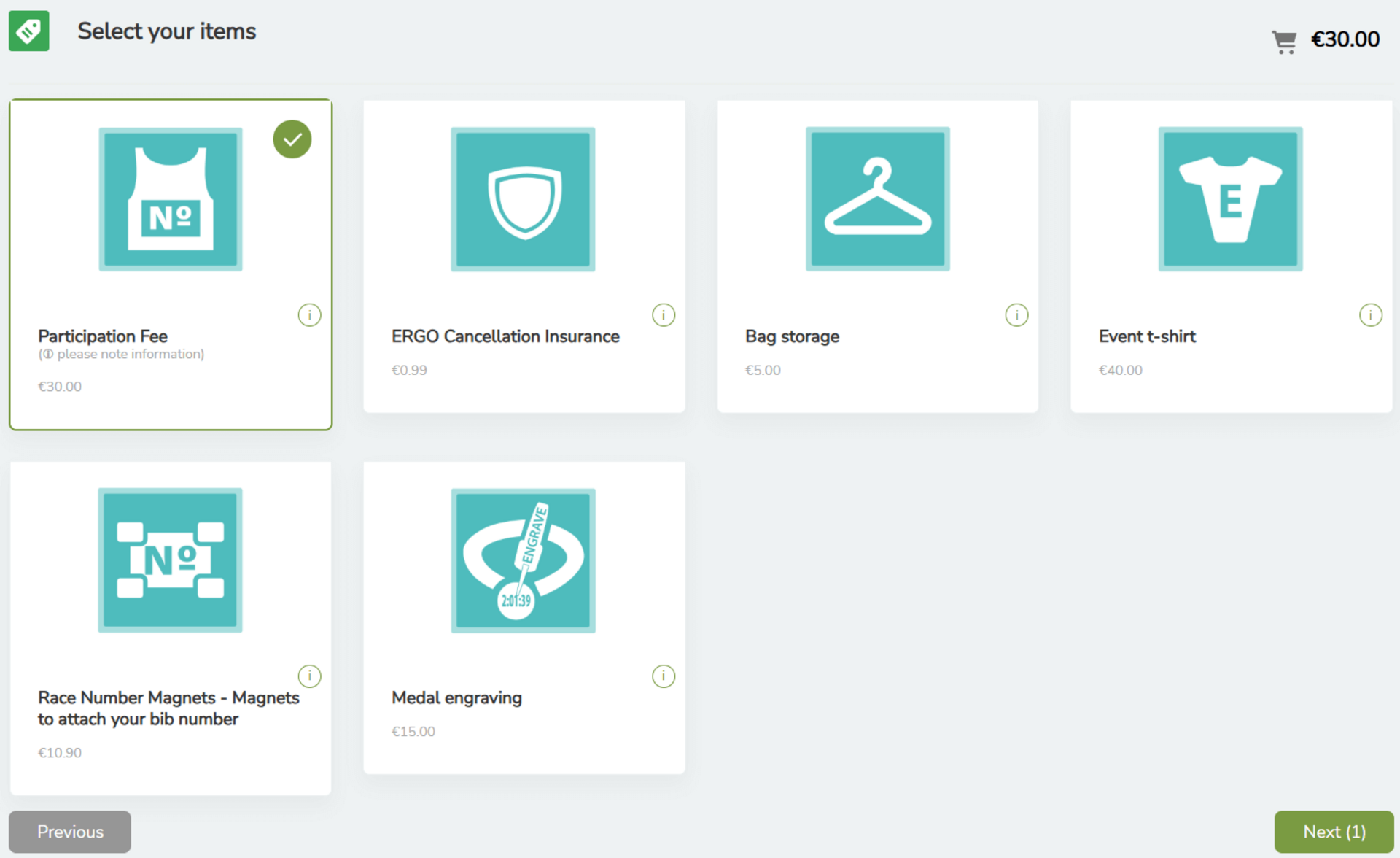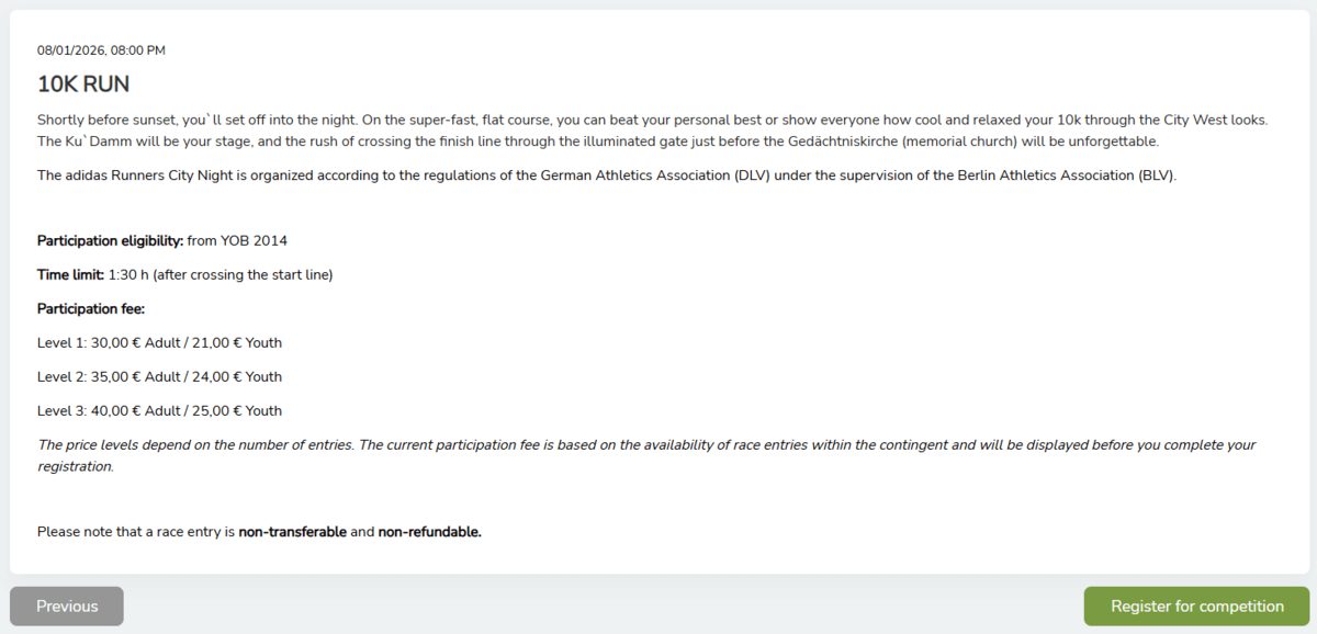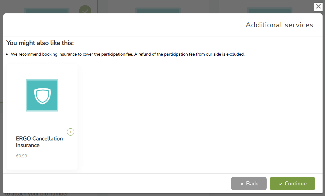 Important: Cancellation insurance and the clothing drop off (specific events), which can be selected for some events, can only be booked here during registration. It is not possible to book these two services at a later date.