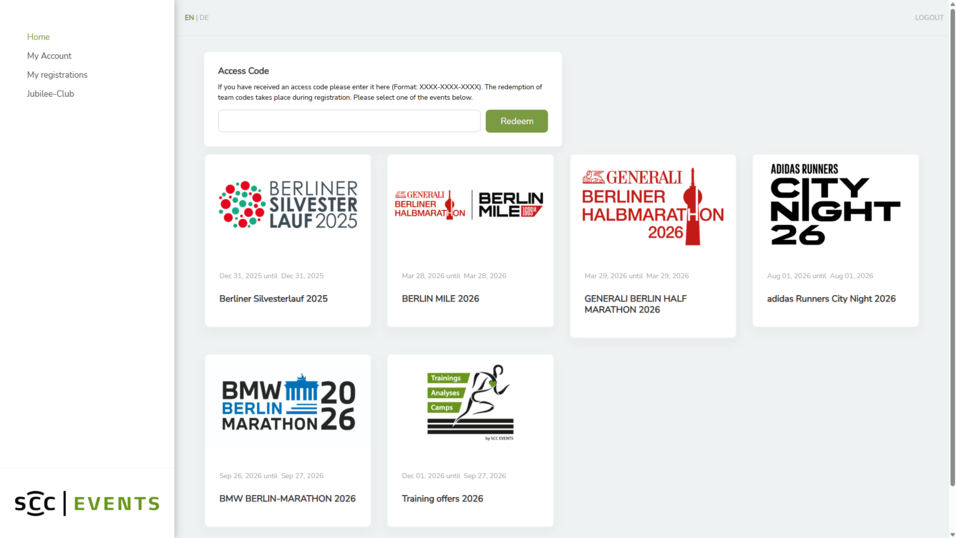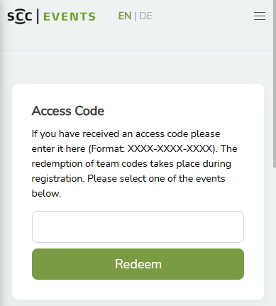 At the top of the page, you will find the input field for access codes. If you already have an access code for an event, enter it in the “Access Code” input field and click on the “Redeem” button. If you do not have an access code, you can ignore this field and scroll down to the list of available events.