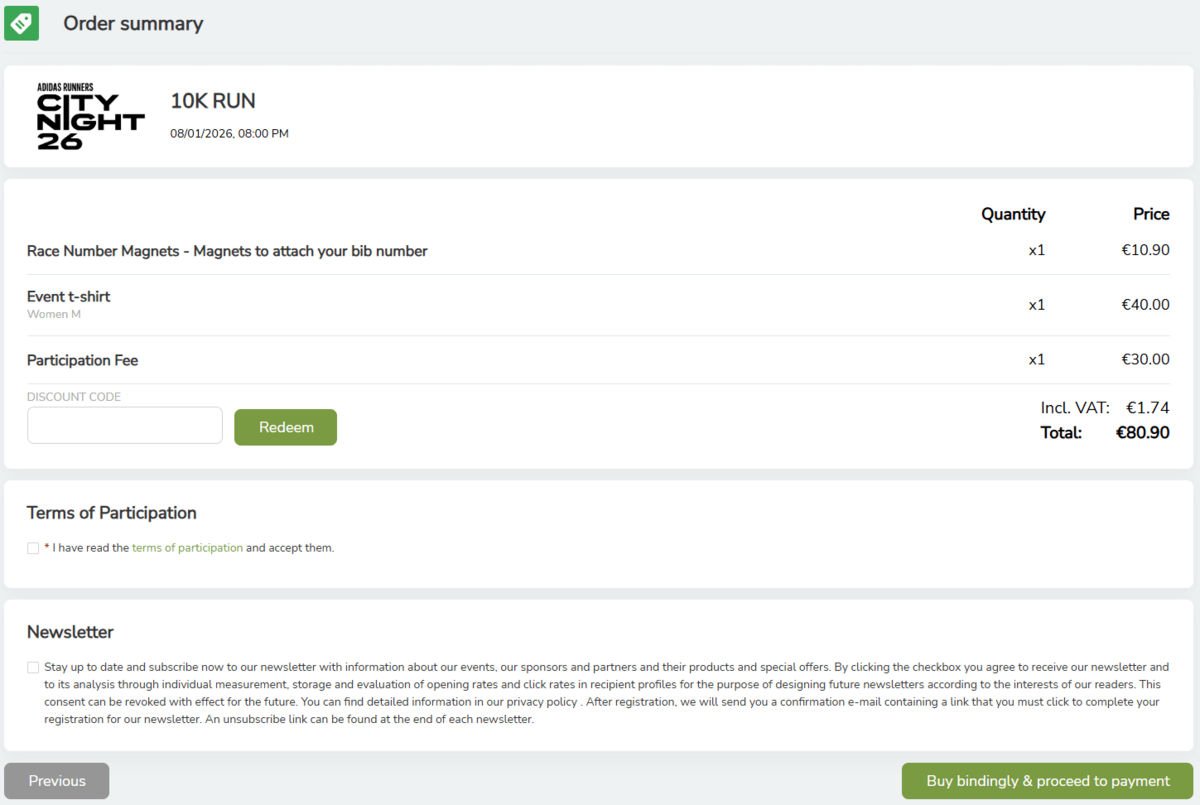 After confirming all required fields, you can complete your registration by clicking on the “Buy bindingly & proceed to payment” button. After this step, your registration is binding and must be completed and paid for.